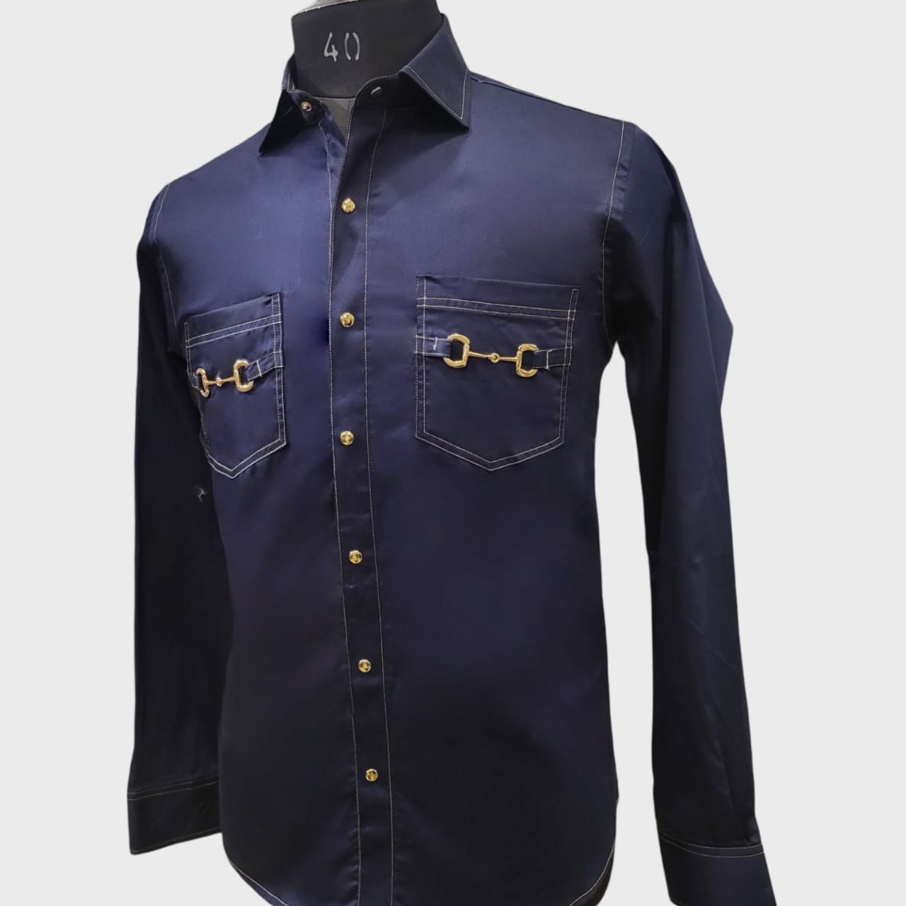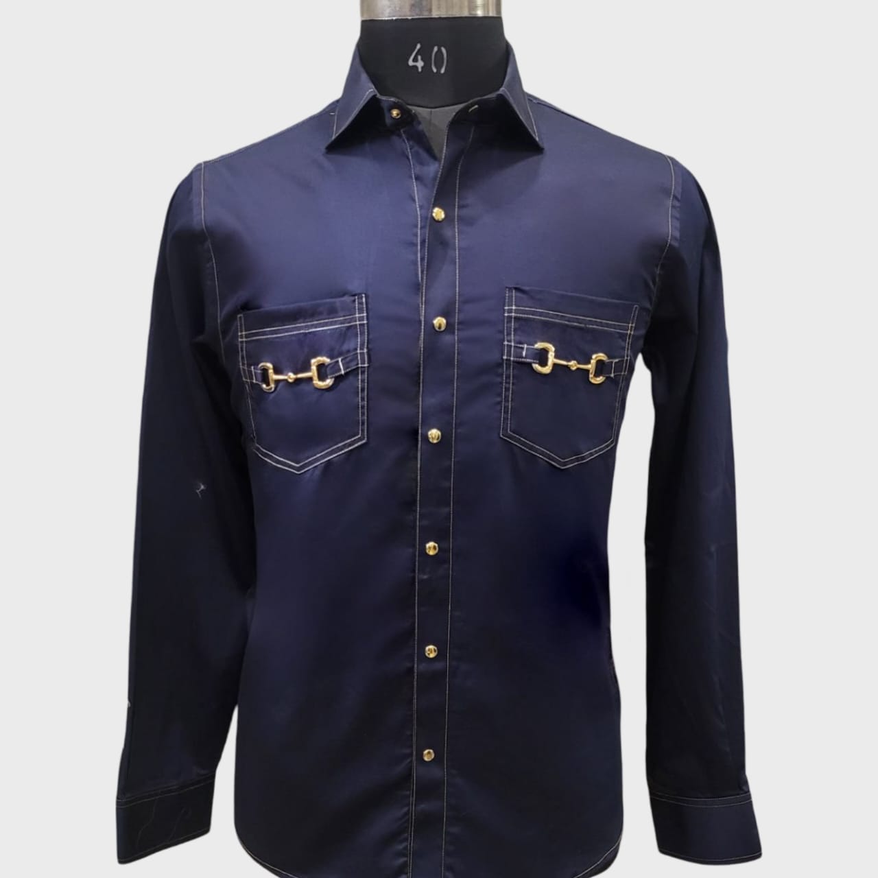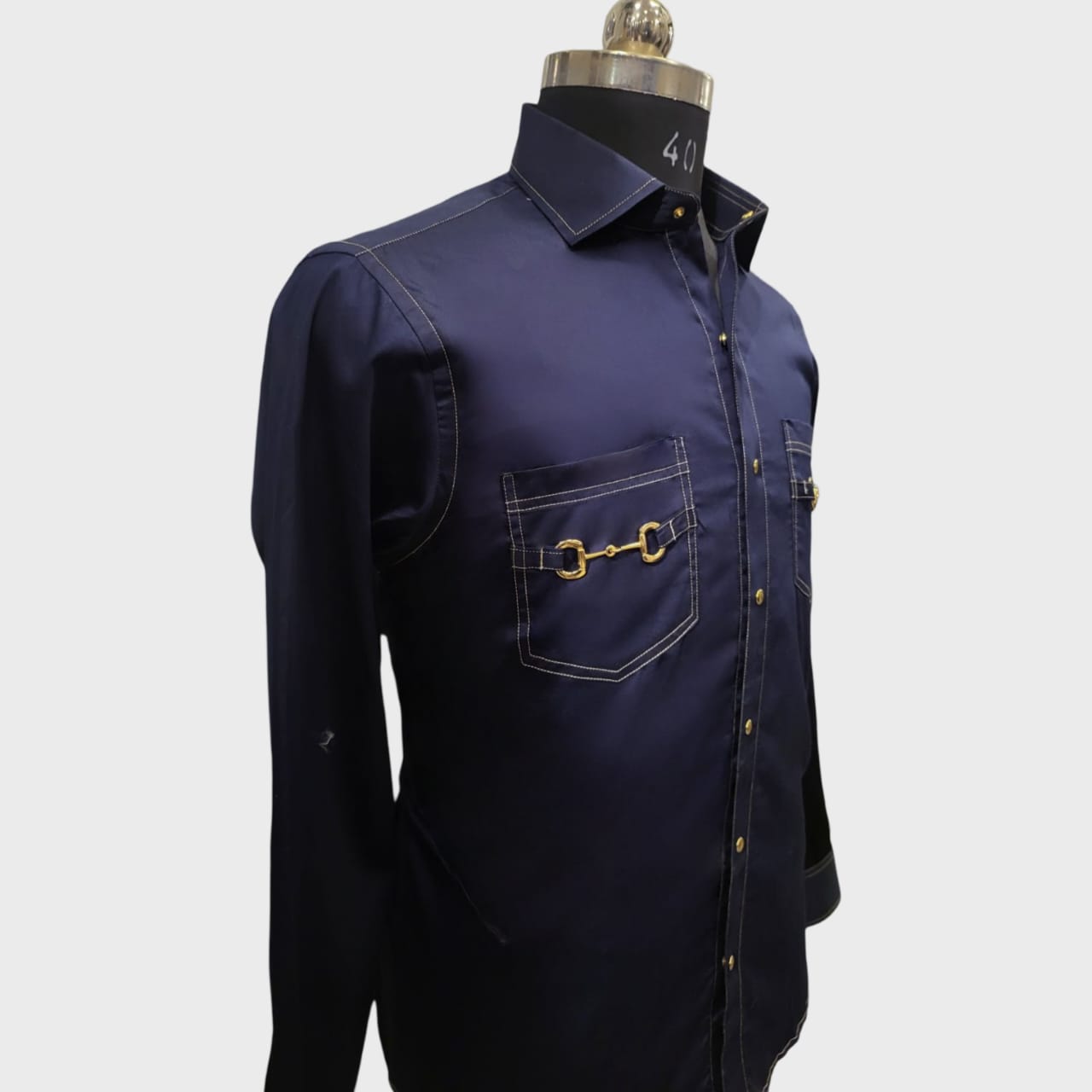This shirt is made in navy blue premium Egyptian Giza Cotton. It has contrast stitching detail.