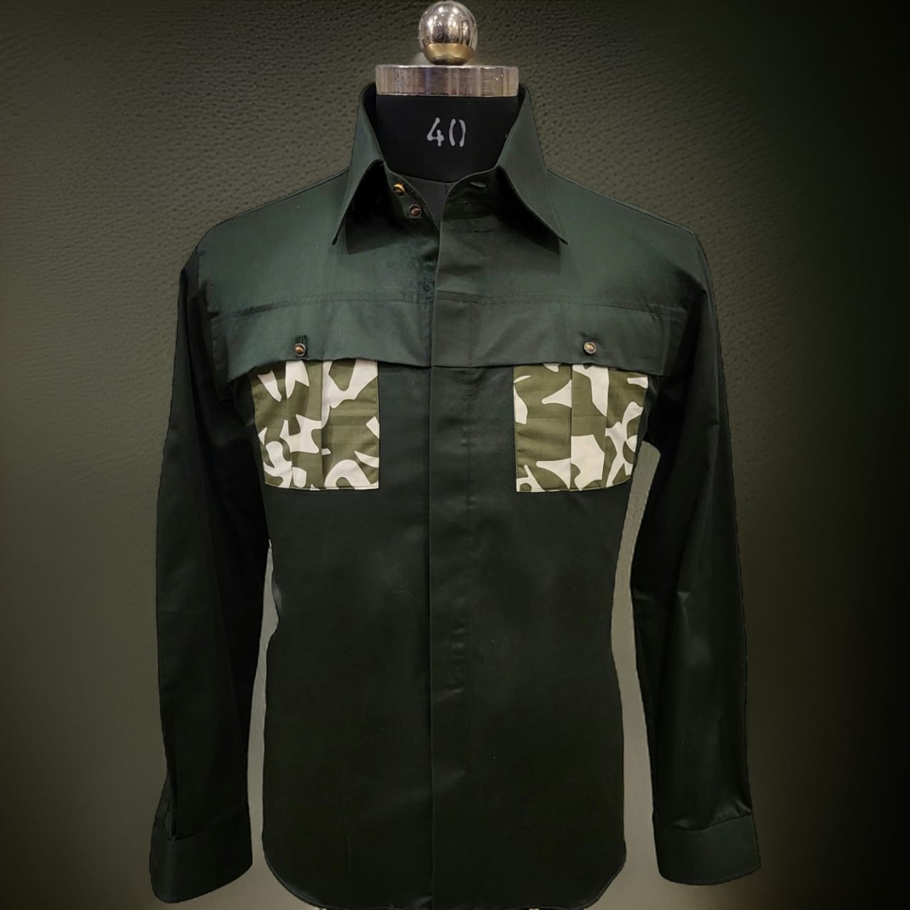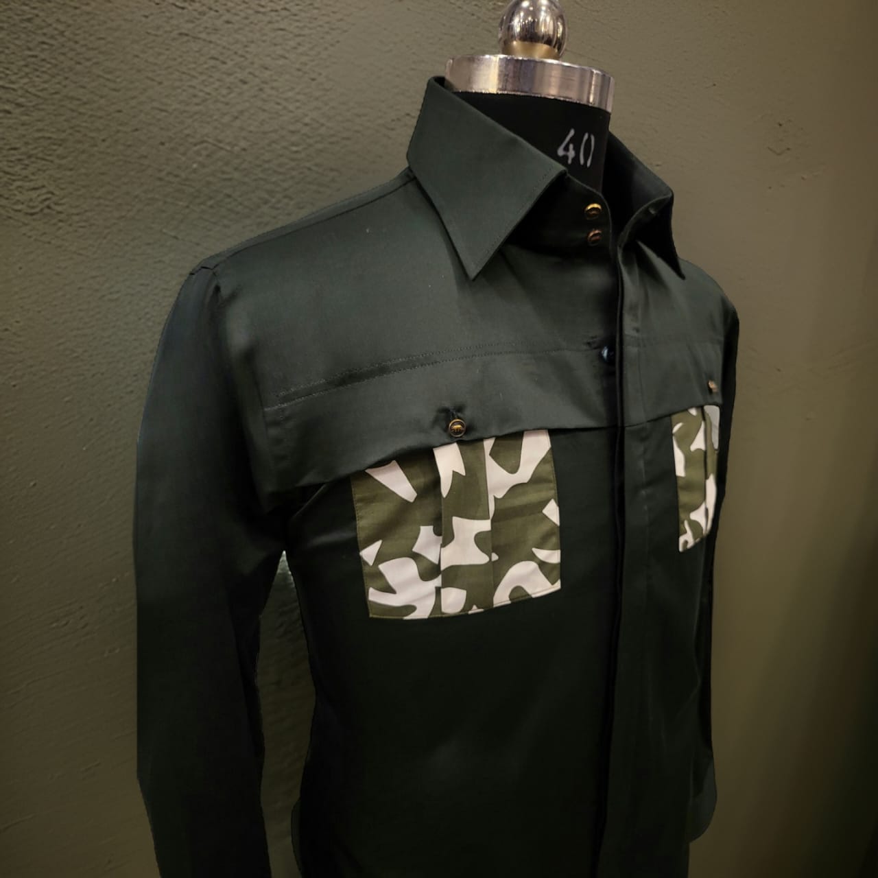 This Shirt is made in green Giza Cotton fabric. It has high collars and side cut cuffs.