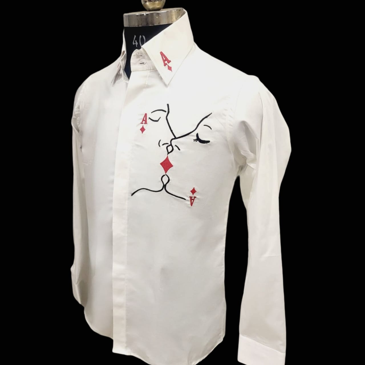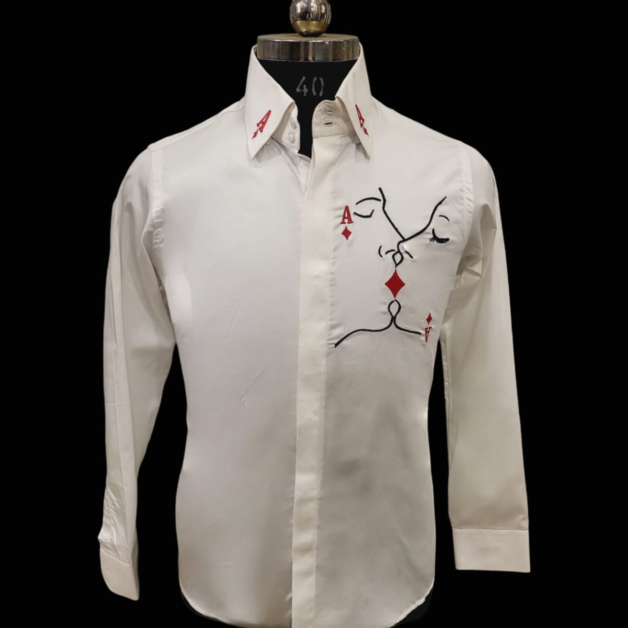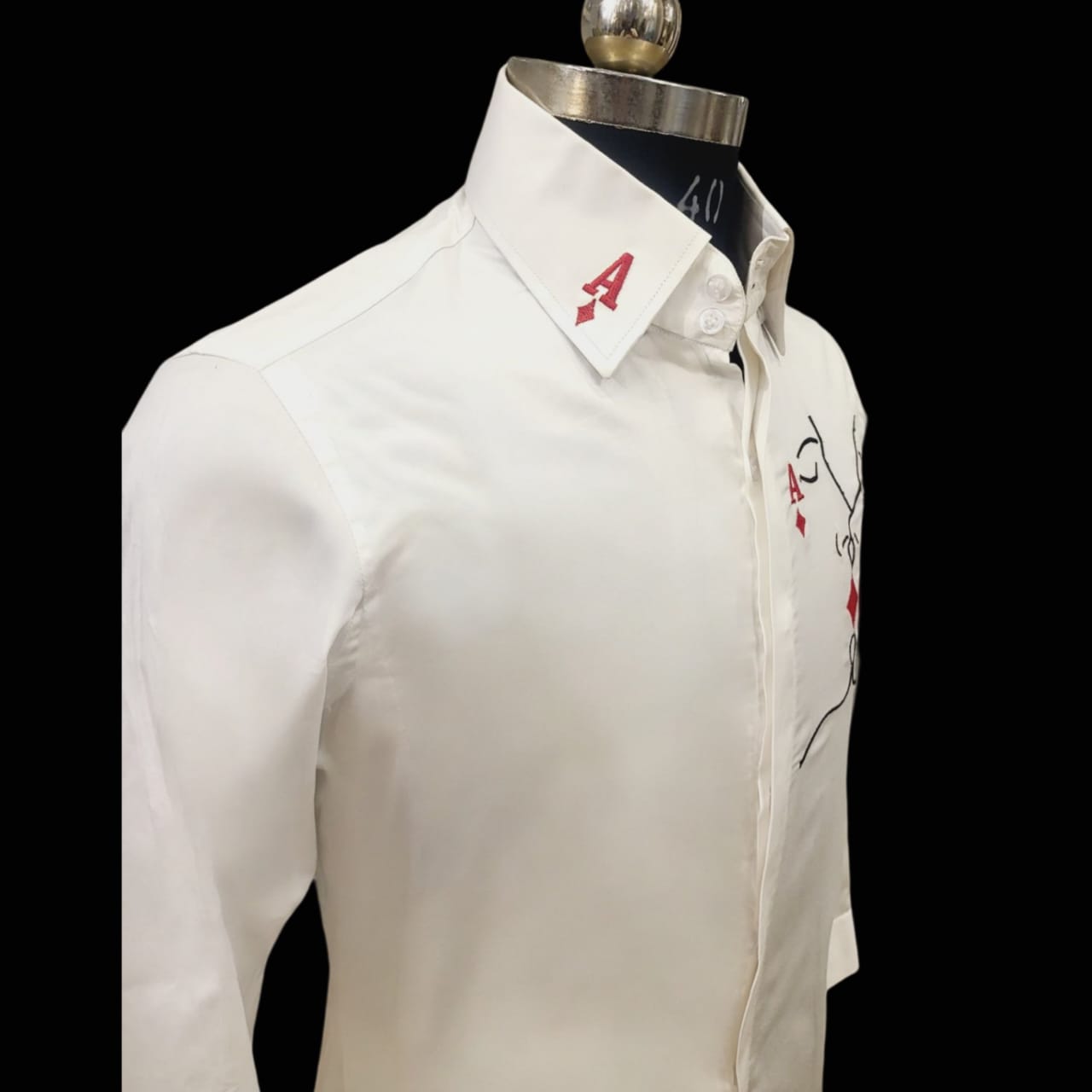 It has Aces cards with faces embroidered on pocket side of shirt with black thread.